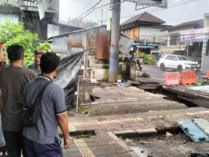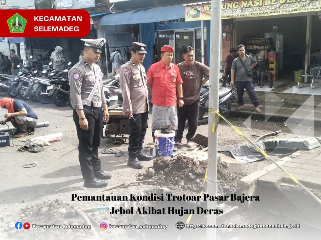 Camat Selemadeg, I Wayan Budhiarsana, S.STP, M.Si., memantau langsung kondisi trotoar di sebelah selatan bekas bak sampah Pasar Bajera yang jebol akibat hujan deras. Kondisi ini mengakibatkan sebagian badan jalan hanyut, sehingga diadakan penutupan satu arah demi keselamatan pengguna jalan, Kamis(26/6).