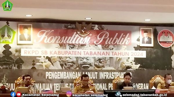 Tahapan perencanaan tahun 2024 saat ini telah memasuki tahapan Penyusunan Rancangan Awal Rencana Kerja Pembangunan Daerah Semesta Berencana (RKPD SB) Kabupaten Tabanan Tahun 2024, untuk penyempurnaan Rancangan Awal RKPD SB dimaksud perlu dilakukan pembahasan dalam forum konsultasi publik. Sehubungan dengan hal tersebut pada hari Senin, 16 Januari 2023 Sekretaris Kecamatan Selemadeg menghadiri acara Konsultasi Publik Rancangan Awal RKPD SB Kabupaten Tabanan Tahun 2024 dengan Tema Pengembangan Lanjut Infrastruktur Menuju Awal Kemajuan Teknis dan Profesional Penunjang Daerah Agrowisata yang diselenggarakan di Ruang Rapat Lantai III Kantor Bupati Tabanan.