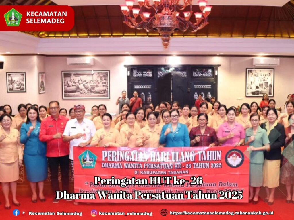 Ketua Unit Dharma Wanita Persatuan Kecamatan Selemadeg menghadiri Peringatan HUT ke- 26 Dharma Wanita Persatuan Tahun 2025 yang diselenggarakan di Ruang Rapat Utama Jayaning Singasana, dengan tema “Peran Strategis Dharma Wanita Dalam Pendidikan Anak Bangsa Untuk Indonesia Emas 2045”, Selasa(9/12)